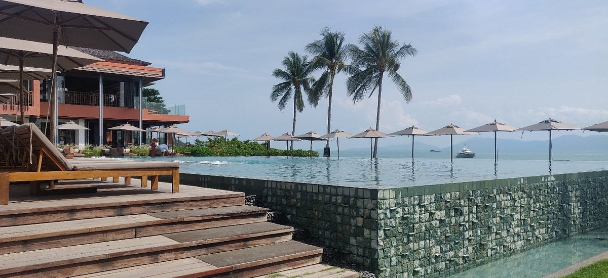 The Hansar Samui Resort boasts two pools with splendid views and a serene atmosphere. The infinity-edge pool stands out as a highlight of the resort, providing stunning glimpses of the Gulf of Thailand. This magnificent pool blends seamlessly with the ocean, resulting in a captivating visual spectacle. The incorporation of natural stone in resorts like to Hansar Samui is often intended to achieve a harmonious connection with the local landscape and present a lavish but natural atmosphere. Common types of natural stone commonly used in such settings may include :