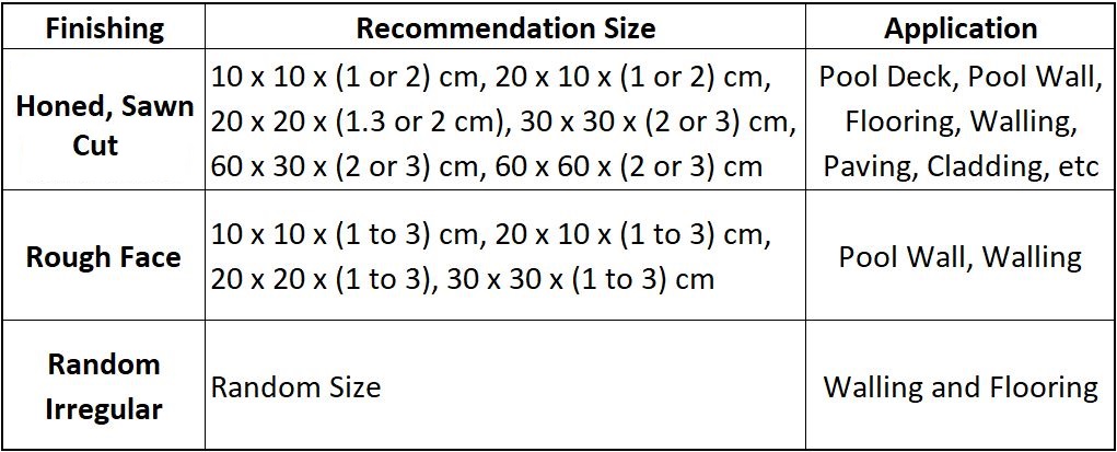 Cream Palimanan Stone can be made to many sizes. For Honed and Sawn Cut, we can cut into 10 x 10 x (1 or 2) cm, 20 x 10 x (1 or 2) cm, 20 x 20 x (1.3 or 2 cm), 30 x 30 x (2 or 3) cm, 60 x 30 x (2 or 3) cm, 60 x 60 x (2 or 3) cm. These recommended sizes are important to keep the stone durability.