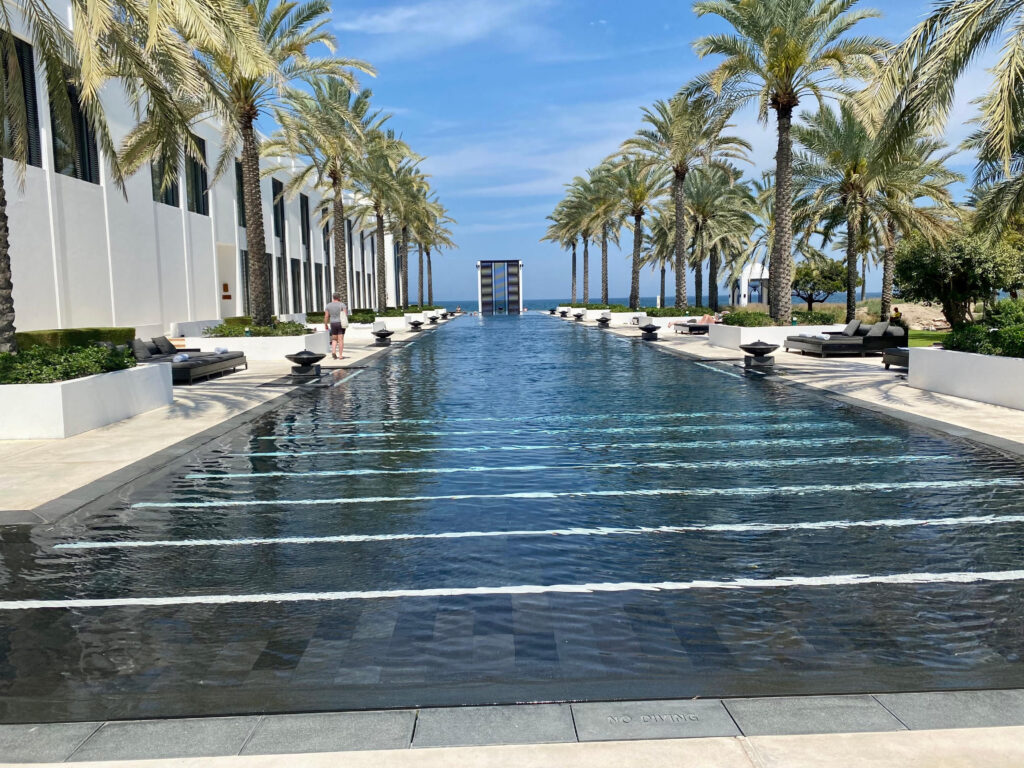 The Chedi Muscat has a unique architectural design and stunning pools that are integral to its luxurious appeal. This resort has three pools which has different theme and vibe. One of them is the most iconic feature of the resort. The 103-meter Long Pool is an architectural marvel. Surrounded by manicured gardens and lounging areas, this pool offers guests an unparalleled sense of tranquility. This pool has an infinity-edge design that seemingly merges with the Gulf of Oman, providing a breathtaking landscape while swimming or lounging. The use of natural stone is a key part of the design of The Chedi Muscat. The stone helps to create a sense of harmony with the natural surroundings and reflects the traditional Omani architecture of the resort.