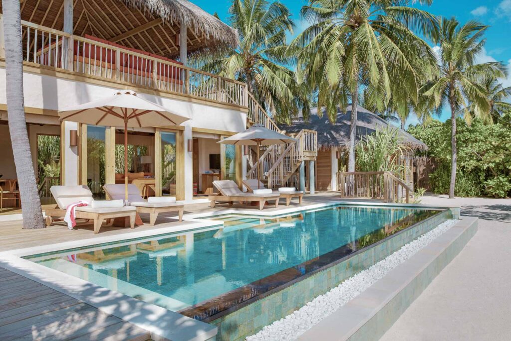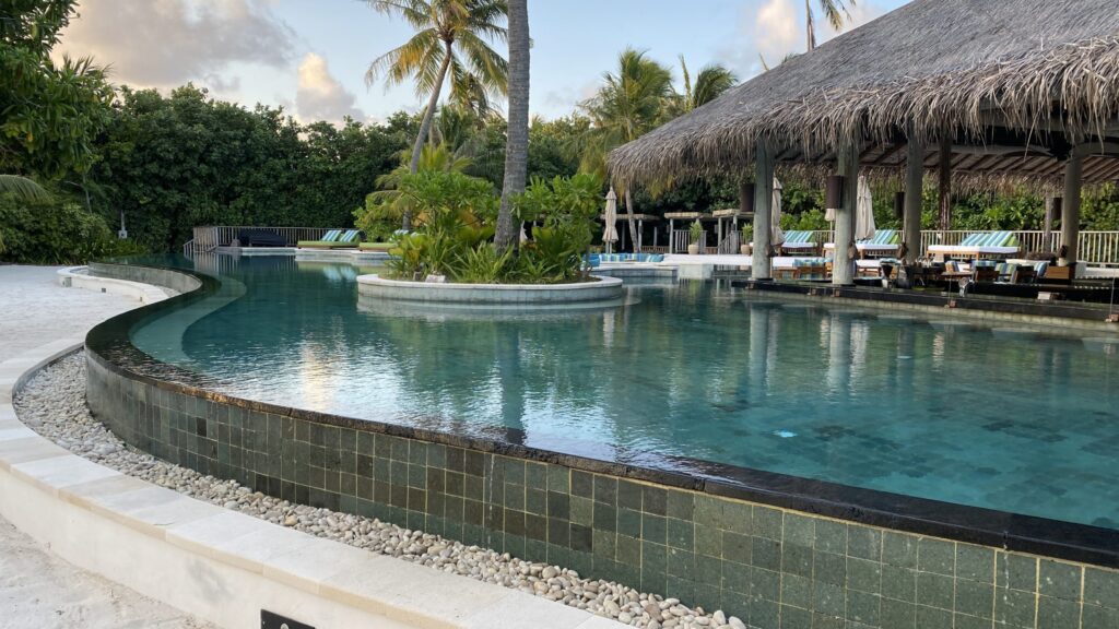 Six Senses Laamu in the Maldives is known for its stunning overwater villas and luxurious amenities, including private pools. Many of the private pools at Six Senses Laamu are designed with an infinity edge, creating a seamless visual connection between the pool and the surrounding ocean. This resort places a strong emphasis on privacy, ensuring that guests can enjoy their pool time without disturbance. Six Senses Laamu is also known for its commitment to sustainability. The design and construction of the overwater villas, including the pools, often incorporate eco-friendly practices and materials. They use natural stones in a few places. Natural stones are commonly found in Six Sense Laamu, include :