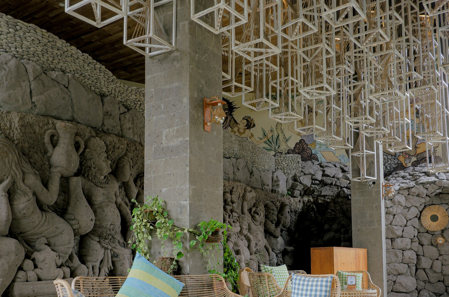 Bali Cream Palimanan stone was applied in Tlaga Singha on the entrance wall. The uniqueness of the wall is the type of stone used, that is Random Irregular type. This stone has a random size with a natural finish that has a unique style and appearance. Best choice is to locate this stone in the front area to have aesthethic appeal and enhance customer interest. Color of Cream Palimanan is matching with the surrounding décoration and green nature color.